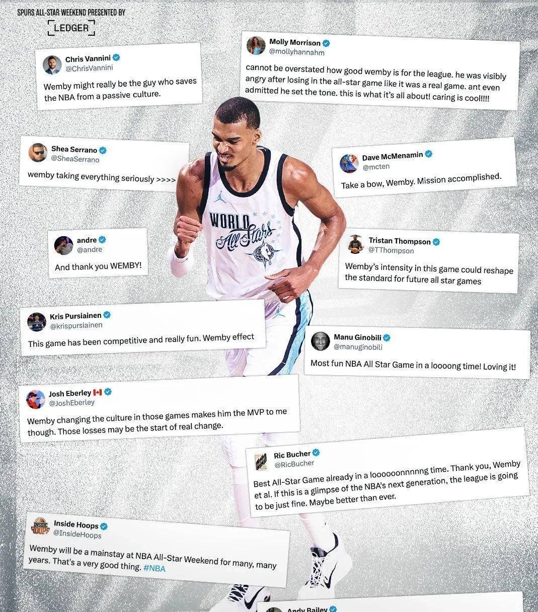 NBA专栏作者贾里德·韦斯写道:“文班亚马曾誓言,要让全明星正赛重回昔日荣光。 今年,他向篮球世界兑现了自己的承诺。 这场比赛的表现,进一步巩固了文班亚马作为NBA下一位门面的地位。 ”