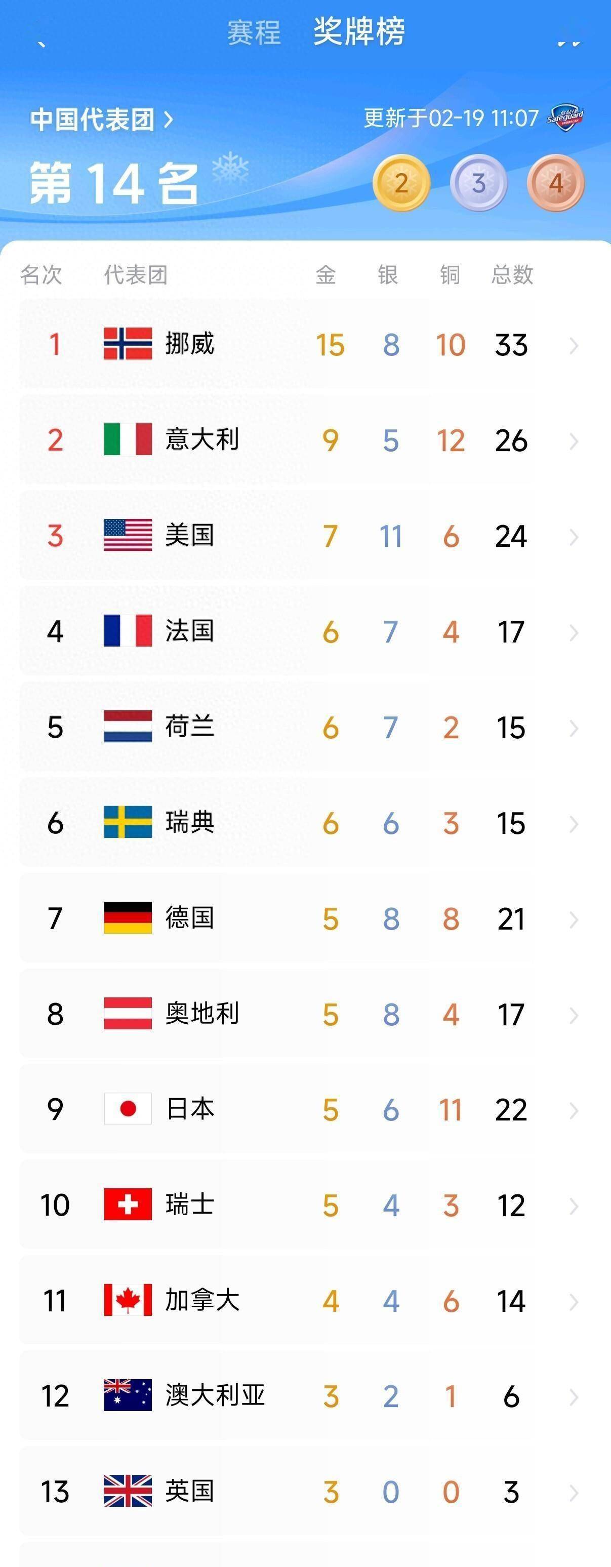 在亚洲阵营的竞争中,格局同样清晰,只是主角换成了日本。 截至第12比赛日,日本代表团以5枚金牌、6枚银牌和11枚铜牌,总计22枚奖牌的成绩,高居奖牌榜第9位。 这个排名意味着日本是唯一一支跻身全球前十的亚洲队伍,在亚洲内部更是遥遥领先。 日本锁定亚洲第一,靠的不是在某一两个项目上的灵光一现,而是令人惊讶的均衡性和全面性。